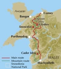 Machynlleth, Abergynolwyn, Dolgellau, Trawsfynydd, Penrhyndeudraeth, Beddgelert, Pen-y-Pass, Dolwyddelan, Capel Curig, Bethesda, Llanfairfechan, Conwy